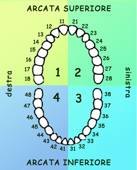 Per facilitare la comunicazione i dentisti sono soliti usare la seguente numerazione dei denti. Questa e’ anche utilizzata sui vostri preventivi per individuare i denti che saranno sottoposti a cure.